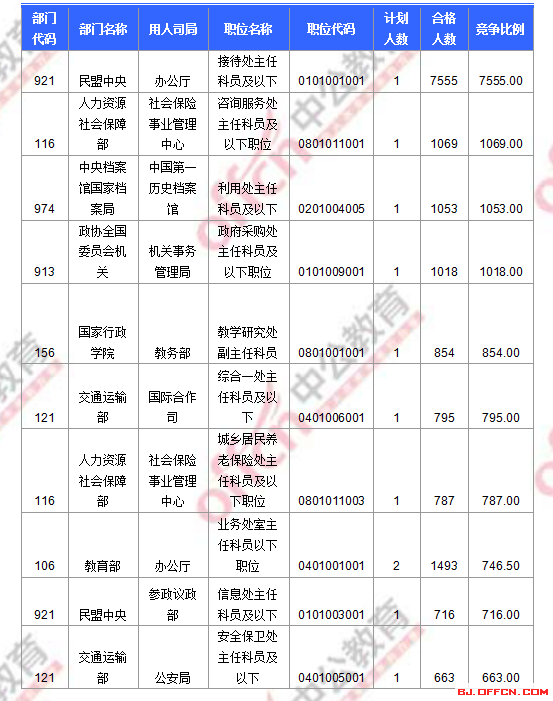 為幫助廣大考生更清晰的了解今日報名情況,北京中公網(wǎng)校整理了合格人數(shù)前十位的部門以及競爭比例最激烈的十大部門,供廣大考生參考: