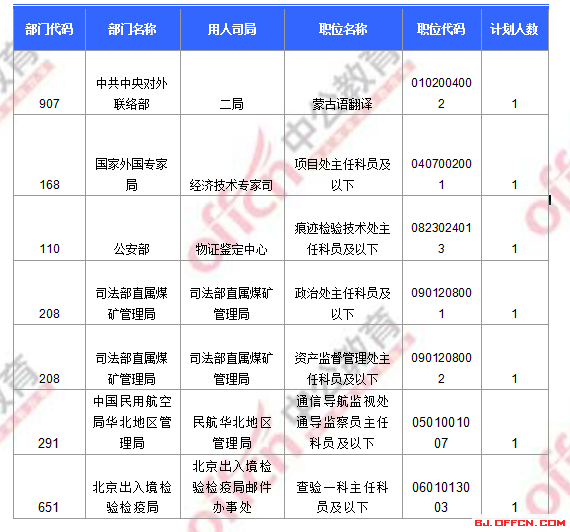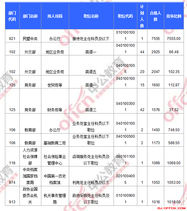 合格人數(shù)前十的職位主要集中在民盟中央、外交部、商務部等部門,具體信息如下:
