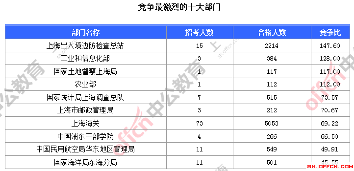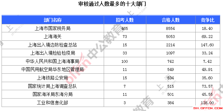 為幫助廣大考生更清晰的了解今日報名情況,上海中公網(wǎng)校整理了審核通過人數(shù)前十位的部門以及競爭比例最激烈的十大部門,供廣大考生參考: