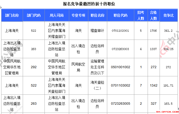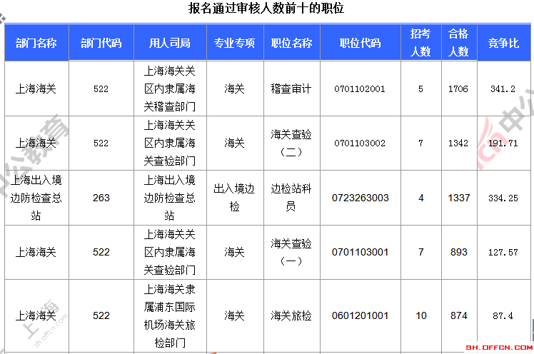 截止到23日16時,上海海關(guān)稽查審計一職擊敗上海出入境邊防檢查總站邊檢站科員成為競爭比例的職位,招錄5人,截止到23日16時通過人數(shù)為1706人。報名通過審核人數(shù)前十的職位主要集中在上海海關(guān)、上海出入境邊防檢查總站、上海鐵路公安局等部門,具體信息如下: