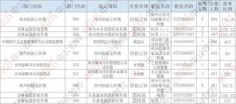 報名通過審核人數(shù)排名前列的職位主要集中在鄭州鐵路公安局、鄭州中牟縣國家稅務(wù)局,鄭州滎陽市國家稅務(wù)局,具體信息如下: