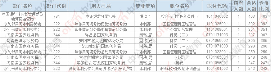 截止23日16時,招錄比例的職位為中公銀行業(yè)監(jiān)督管理委員會河南監(jiān)管局安陽銀監(jiān)分局機(jī)關(guān)綜合部門主任科員以下一職,招錄1人,截止23日16時通過人數(shù)為403人。