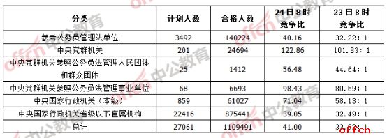 10月24日,2017國(guó)家公務(wù)員考試報(bào)名進(jìn)入了最后一天,據(jù)中公網(wǎng)校數(shù)據(jù)統(tǒng)計(jì),截至24日8時(shí),經(jīng)過(guò)了近9天又1夜的報(bào)名后,報(bào)名系統(tǒng)已經(jīng)審核通過(guò)了1109491人,略高于去年同期的109萬(wàn),較昨天下午16時(shí)的數(shù)據(jù)相比,報(bào)名合格人數(shù)增加了8萬(wàn)余人,平均競(jìng)爭(zhēng)比為41:1。民盟中央辦公廳接待處主任科員及以下(101001001)這一職位目前競(jìng)爭(zhēng)比已經(jīng)高達(dá)8362:1,與其熱度相反的是,截至24日8時(shí),仍有323個(gè)崗位報(bào)考人數(shù)還未破零,約占2%。中央黨群機(jī)關(guān)參照公務(wù)員法管理人民團(tuán)體和群眾團(tuán)體系統(tǒng)、中央黨群機(jī)關(guān)參照公務(wù)員法管理事業(yè)單位這兩個(gè)系統(tǒng)的所有職位已經(jīng)全部有人過(guò)審,報(bào)考率達(dá)100%。