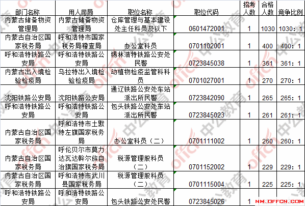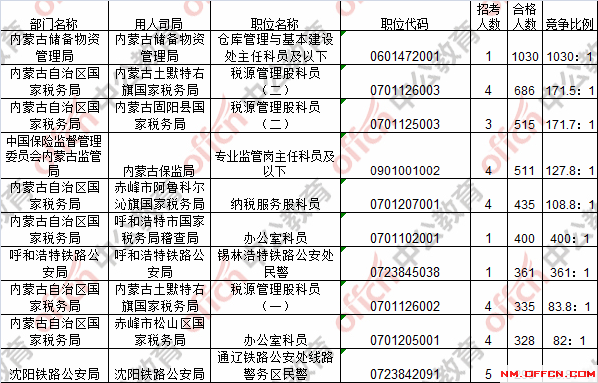 報名通過審核人數(shù)前十的職位主要集中在內蒙古儲備物資管理局、內蒙古土默特右旗國家稅務局、內蒙古固陽縣國家稅務局等部門,具體信息如下: