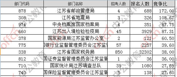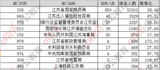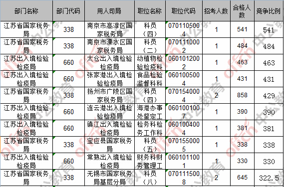 報名通過審核人數(shù)前十的職位主要集中在江蘇省國家稅務(wù)局、江蘇出入境檢驗檢疫局,具體信息如下: