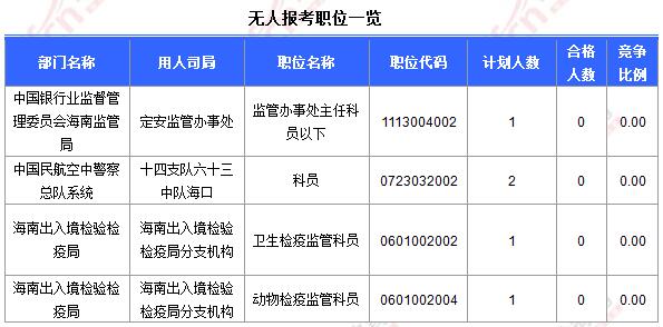 截止到24日8時(shí),工作地點(diǎn)在海南的職位共有4個(gè)無(wú)人報(bào)考。海南中公網(wǎng)校提醒廣大考生,報(bào)名最后一天,能選人少的盡量選擇!