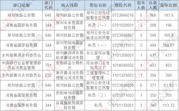 報名通過審核人數(shù)排名前列的職位主要集中在鄭州鐵路公安局、河南省國家稅務局,水利部黃河水利委員會,具體信息如下: