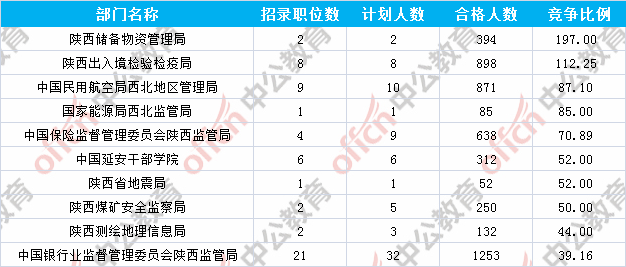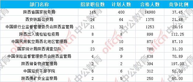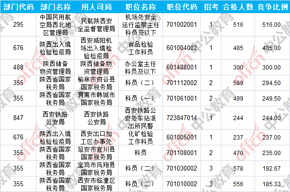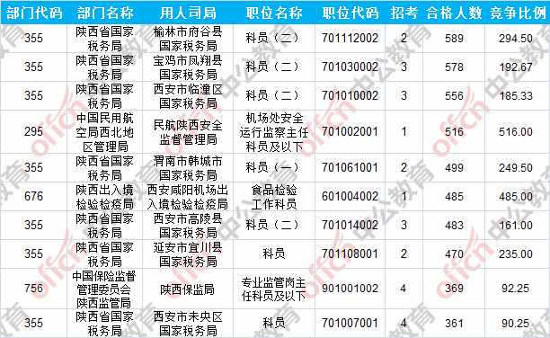 報(bào)名通過(guò)審核人數(shù)前十的職位主要集中在陜西出入境檢驗(yàn)檢疫局、陜西省國(guó)家稅務(wù)局、中國(guó)民用航空局西北地區(qū)管理局等部門,具體信息如下: