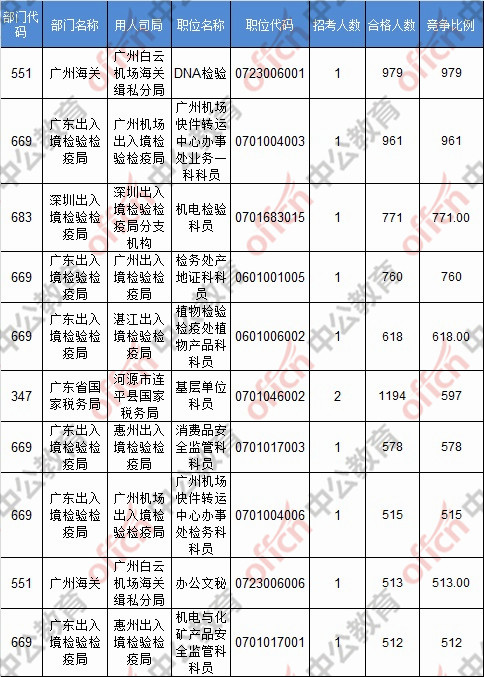 截止到24日17點(diǎn)30分,競(jìng)爭(zhēng)比例的職位為廣州海關(guān)廣州白云機(jī)場(chǎng)海關(guān)緝私分局DNA檢驗(yàn)一職,招錄1人,截止到24日17點(diǎn)30分通過(guò)人數(shù)為979人。