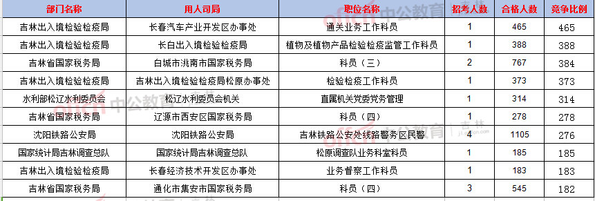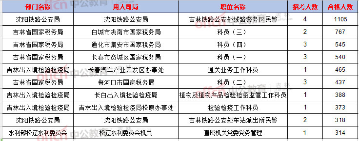 報名通過審核人數(shù)前十的職位主要集中在吉林省國稅局和吉林出入境檢驗檢疫局,具體信息如下: