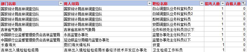 截止到24日17:30,工作地點在吉林的職位共有9個崗位無人報考。下面是無人報考職位一覽表。