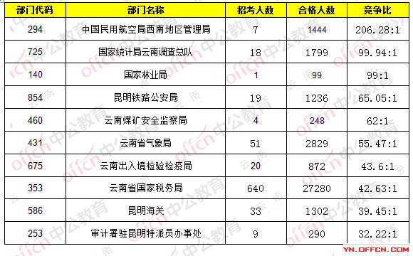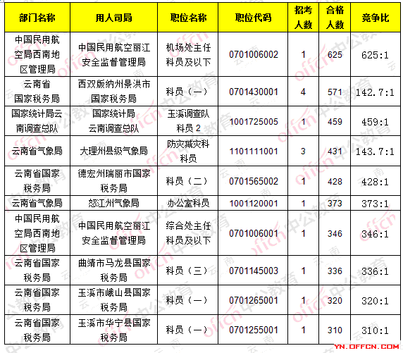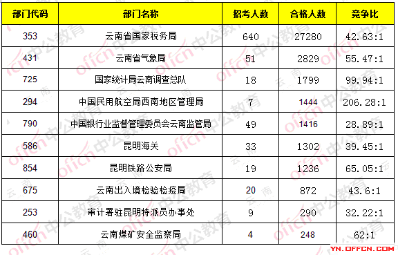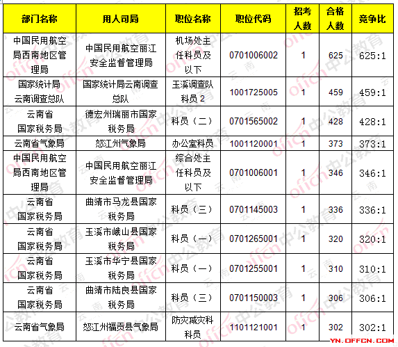報(bào)名通過(guò)審核人數(shù)前十的職位主要集中在中國(guó)民用航空局西南地區(qū)管理局、云南省國(guó)家稅務(wù)局、國(guó)家統(tǒng)計(jì)局云南調(diào)查總隊(duì)等部門(mén),具體信息如下: