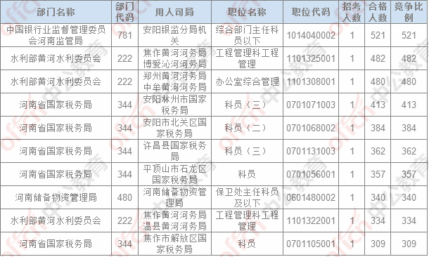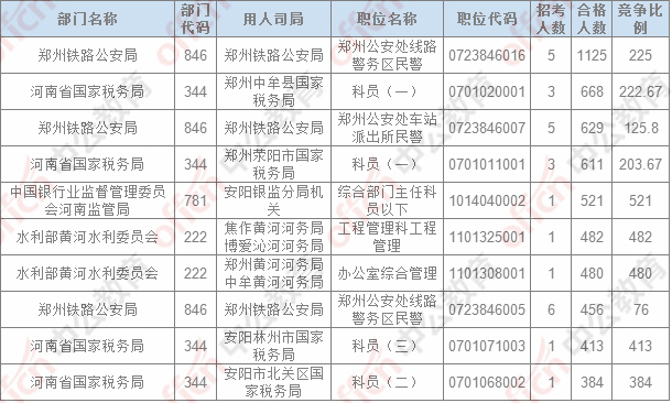 報名通過審核人數(shù)排名前列的職位主要集中在鄭州鐵路公安局、河南省國家稅務(wù)局,中國銀行業(yè)監(jiān)督管理委員會河南監(jiān)管局,具體信息如下: