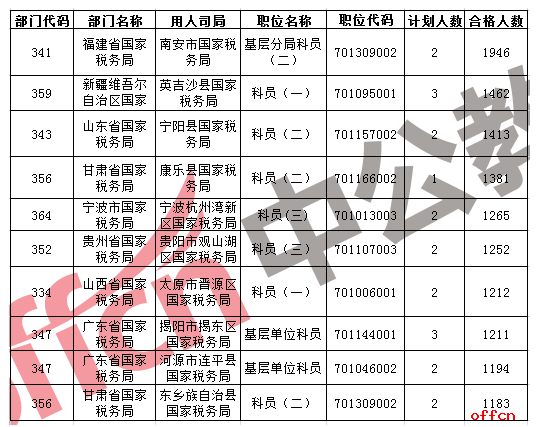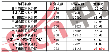 2017國考國稅系統(tǒng)37個部門共提供9455個職位,招錄17476人。截至24日17:30,總報名審核通過人數(shù)為756571人,競爭比例為43:1,仍有10個職位無人報考,在這10個職位中有9個來自黑龍江省國稅系統(tǒng),剩下的一個來自浙江省國家稅務系統(tǒng)。下面是中公網校統(tǒng)計的國稅系統(tǒng)報名情況,供考生參考: