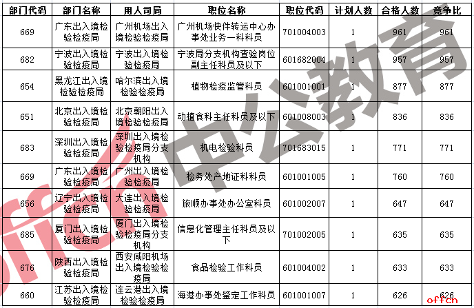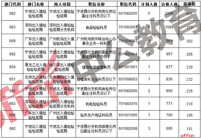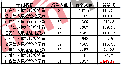2017國考出入境檢驗檢疫系統(tǒng)32個部門共提供759個職位,招錄899人。截至24日17:30,總報名審核通過人數為81694人,競爭比例為90.87:1,仍有39個職位無人報考,其余所有職位均有人通過審核。下面是中公網校統(tǒng)計的出入境檢驗檢疫系統(tǒng)報名情況,供考生參考: