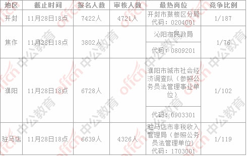 中公教育還就各地區(qū)的各崗位具體報名人數(shù)進(jìn)行了統(tǒng)計分析,截至11月28日,河南省考部分地區(qū)崗位的具體報名情況如下: