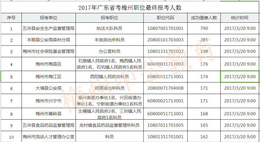 2017廣東省考各職位最終報(bào)名人數(shù)【梅州考區(qū)】,總計(jì)17200人報(bào)考,最熱職位比例1:790