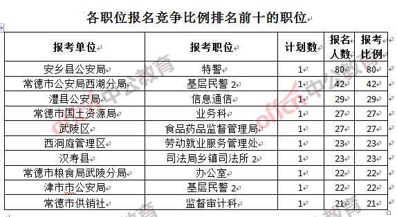 競(jìng)爭(zhēng)熱門職位,前三位依次是:安鄉(xiāng)縣公安局特警(競(jìng)爭(zhēng)比例80:1)、常德市公安局西湖分局基層民警2(競(jìng)爭(zhēng)比例42:1)和澧縣公安局信息通信(競(jìng)爭(zhēng)比例29:1)。