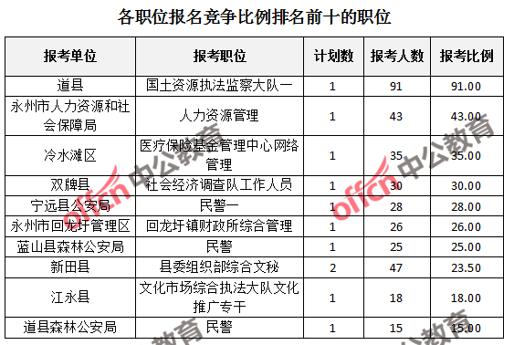 競(jìng)爭(zhēng)熱門(mén)職位,前三位依次是:道縣國(guó)土資源執(zhí)法監(jiān)察大隊(duì)一(競(jìng)爭(zhēng)比例91:1)、永州市人力資源和社會(huì)局人力資源管理(競(jìng)爭(zhēng)比例43:1)和冷水灘區(qū)醫(yī)療保險(xiǎn)基金管理中心網(wǎng)絡(luò)管理(競(jìng)爭(zhēng)比例35:1)。