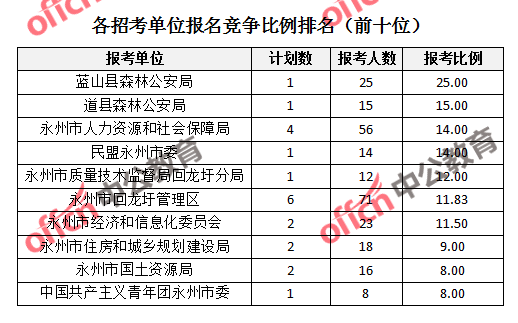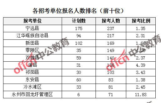 為幫助廣大考生更清晰的了解報(bào)名情況,中公教育整理了永州市各招考單位的報(bào)名人數(shù)排名以及競(jìng)爭(zhēng)比例排名,供廣大考生參考: