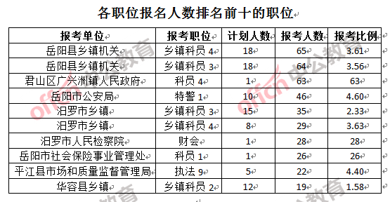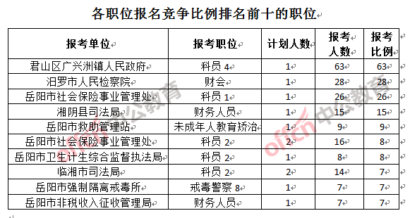 競(jìng)爭(zhēng)熱門(mén)職位,前三位依次是:君山區(qū)廣興洲鎮(zhèn)人民政府科員4(競(jìng)爭(zhēng)比例63:1)、汨羅市人民檢察院財(cái)會(huì)(競(jìng)爭(zhēng)比例28:1)和岳陽(yáng)市社會(huì)保險(xiǎn)事業(yè)管理處科員1(競(jìng)爭(zhēng)比例26:1)。