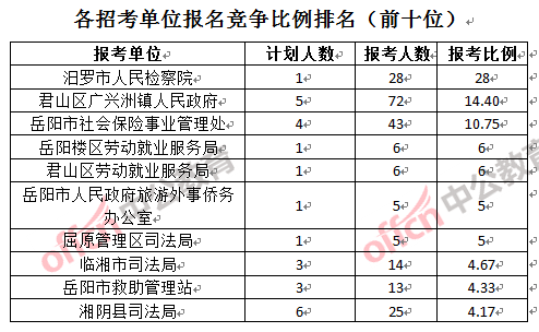 競(jìng)爭(zhēng)熱門(mén)招考單位,前三位依次是:汨羅市人民檢察院(競(jìng)爭(zhēng)比例28:1)、君山區(qū)廣興洲鎮(zhèn)人民政府(競(jìng)爭(zhēng)比例14.4:1)和岳陽(yáng)市社會(huì)保險(xiǎn)事業(yè)管理處(競(jìng)爭(zhēng)比例10.75:1)。