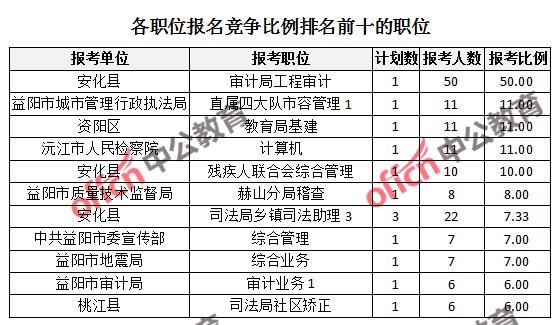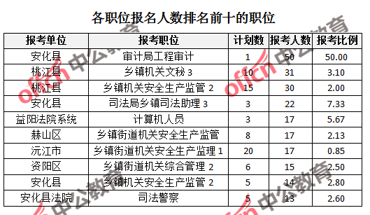 競(jìng)爭(zhēng)熱門(mén)職位,前三位依次是:安化縣審計(jì)局工程審計(jì)(競(jìng)爭(zhēng)比例50:1)、益陽(yáng)市城市管理行政執(zhí)法局直屬四大隊(duì)市容管理1(競(jìng)爭(zhēng)比例11:1)和資陽(yáng)區(qū)教育局基建(競(jìng)爭(zhēng)比例11:1)以及沅江市人民檢察院計(jì)算機(jī)(競(jìng)爭(zhēng)比例11:1)、安化縣殘疾人聯(lián)合會(huì)綜合管理(競(jìng)爭(zhēng)比例10:1)。