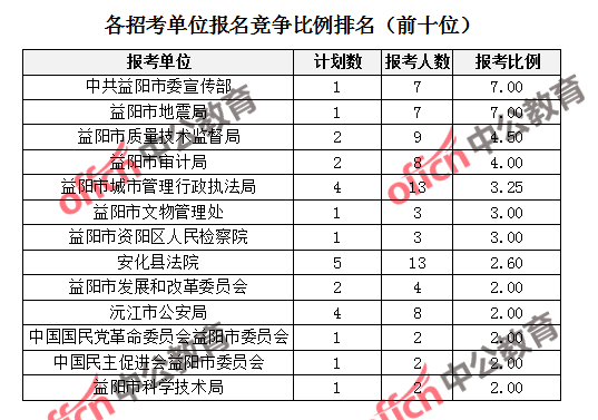 為幫助廣大考生更清晰的了解報(bào)名情況,中公教育整理了益陽(yáng)市各招考單位的報(bào)名人數(shù)排名以及競(jìng)爭(zhēng)比例排名,供廣大考生參考: