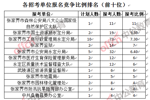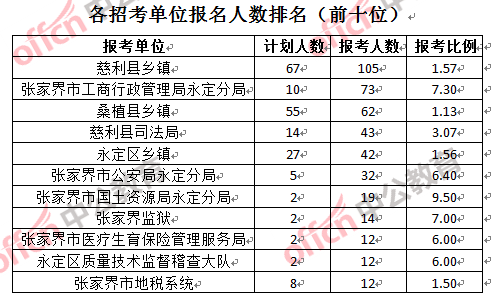 為幫助廣大考生更清晰的了解報(bào)名情況,中公教育整理了張家界市各招考單位的報(bào)名人數(shù)排名以及競(jìng)爭(zhēng)比例排名,供廣大考生參考: