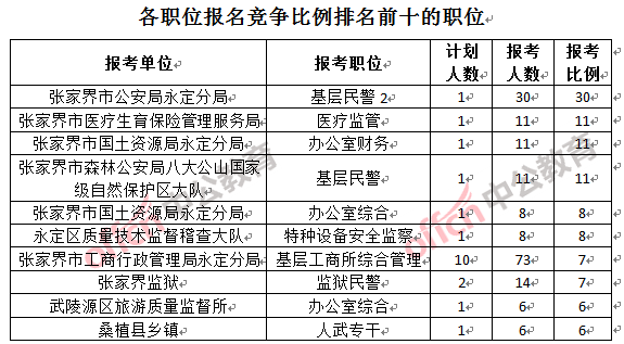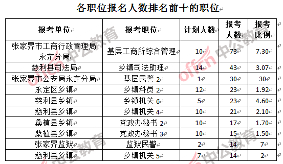 為幫助廣大考生更清晰的了解報(bào)名情況,中公教育整理了張家界市各職位的報(bào)名人數(shù)排名以及競(jìng)爭(zhēng)比例排名,供廣大考生參考: