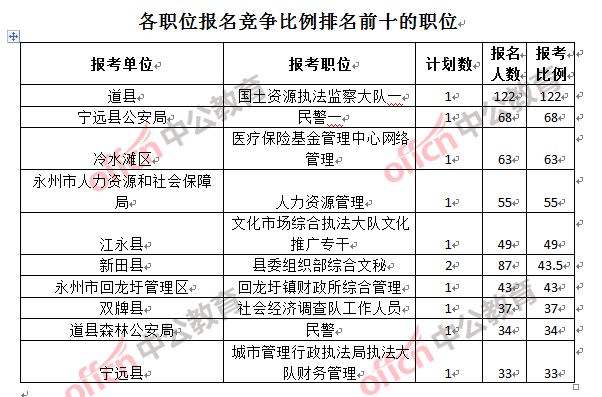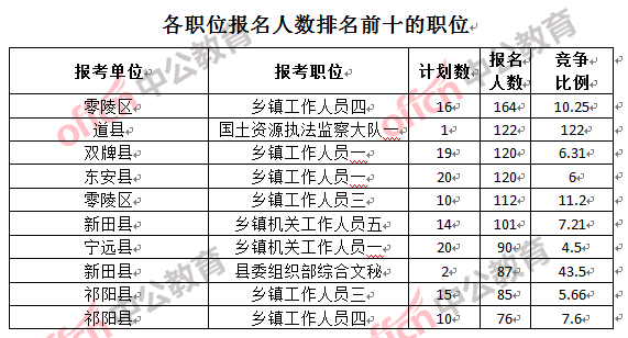 競爭熱門職位,前三位依次是:道縣國土資源執(zhí)法監(jiān)察大隊一(競爭比例122:1)、寧遠縣公安局民警一(競爭比例68:1)和冷水灘區(qū)醫(yī)療保險基金管理中心網(wǎng)絡管理(競爭比例63:1)。