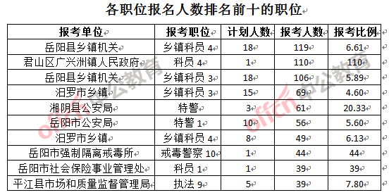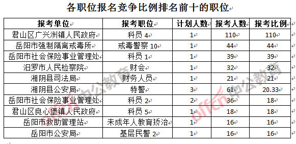 為幫助廣大考生更清晰的了解報名情況,中公教育整理了岳陽市各職位的報名人數(shù)排名以及競爭比例排名,供廣大考生參考: