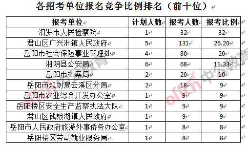 競(jìng)爭(zhēng)熱門(mén)招考單位,前三位依次是:汨羅市人民檢察院(競(jìng)爭(zhēng)比例32:1)、君山區(qū)廣興洲鎮(zhèn)人民政府(競(jìng)爭(zhēng)比例26.2:1)和岳陽(yáng)市社會(huì)保險(xiǎn)事業(yè)管理處(競(jìng)爭(zhēng)比例20:1)。