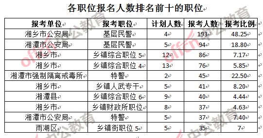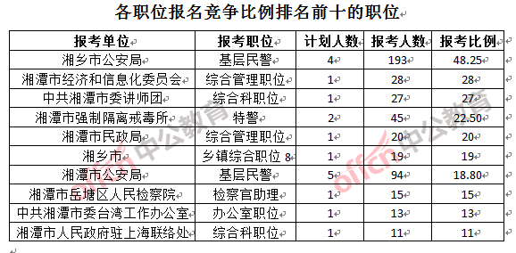 競爭最熱門職位,前三位依次是:湘鄉(xiāng)市公安局基層民警(競爭比例48.25:1)、湘潭市經(jīng)濟和信息化委員會綜合管理職位(競爭比例28:1)和中共湘潭市委團綜合科職位(競爭比例27:1)。
