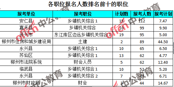 為幫助廣大考生更清晰的了解報名情況,中公教育整理了湖南郴州各職位的報名人數(shù)排名以及競爭比例排名,供廣大考生參考:
