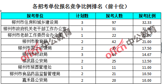 競爭熱門招考單位,前三位依次是:郴州市住房和城鄉(xiāng)建設(shè)局(競爭比例32.33:1)、郴州市政府機關(guān)老干部工作辦公室(競爭比例31:1)和郴州市老齡工作委員會辦公室(競爭比例22:1)。