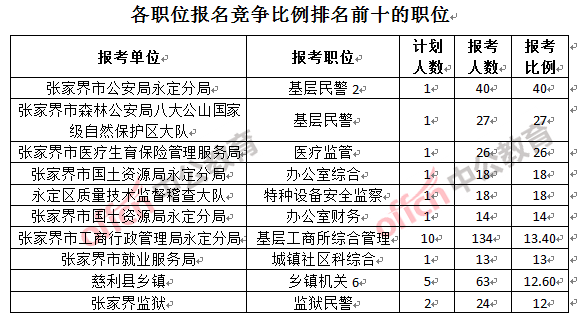 競爭最熱門職位,前三位依次是:張家界市公安局永定分局基層民警2(競爭比例40:1)、張家界市森林公安局八大公山自然保護區(qū)大隊基層民警(競爭比例27:1)和張家界市醫(yī)療生育保險管理服務局醫(yī)療監(jiān)管(競爭比例26:1)。