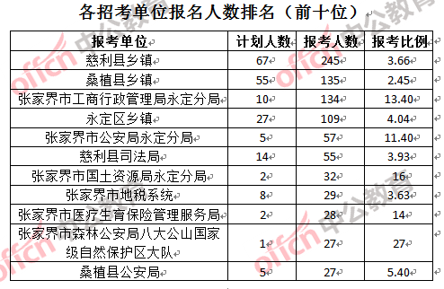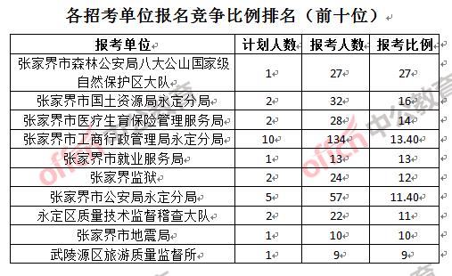 競爭熱門招考單位,前三位依次是:張家界市森林公安局八大公山自然保護(hù)區(qū)大隊(duì)(競爭比例27:1)、張家界市國土資源局永定分局(競爭比例16:1)和張家界市醫(yī)療生育保險(xiǎn)管理服務(wù)局(競爭比例14:1)。