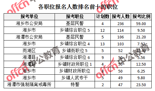 競爭熱門職位,前三位依次是:湘鄉(xiāng)市公安局基層民警(競爭比例59:1)、湘潭市經(jīng)濟(jì)和信息化委員會綜合管理職位(競爭比例43:1)、湘鄉(xiāng)市鄉(xiāng)鎮(zhèn)綜合職位8(競爭比例36:1)。