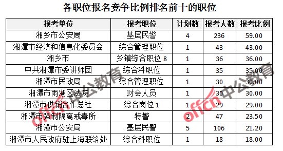 為幫助廣大考生更清晰的了解報名情況,中公教育整理了湘潭市各職位的報名人數(shù)排名以及競爭比例排名,供廣大考生參考: