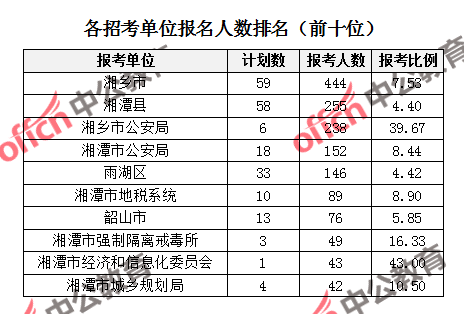 為幫助廣大考生更清晰的了解報名情況,中公教育整理了湘潭市各招考單位的報名人數(shù)排名以及競爭比例排名,供廣大考生參考: