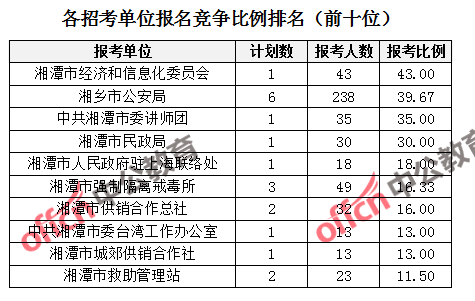競爭熱門招考單位,前三位依次是:湘潭市經(jīng)濟(jì)和信息化委員會(競爭比例43:1)、湘鄉(xiāng)市公安局(競爭比例39.67:1)、中共湘潭市委團(tuán)(競爭比例35:1)。