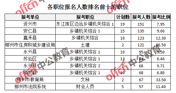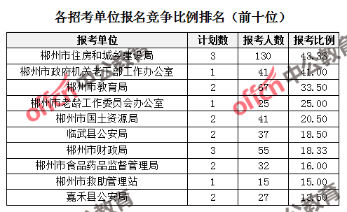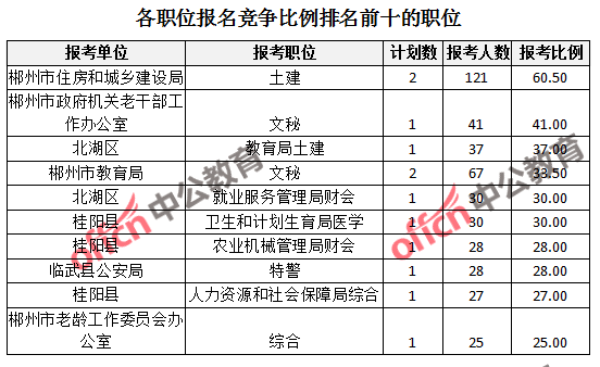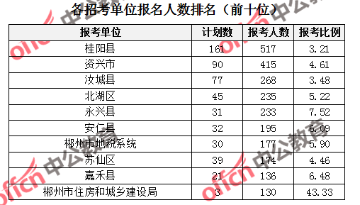 為幫助廣大考生更清晰的了解報(bào)名情況,中公教育整理了郴州市各招考單位的報(bào)名人數(shù)排名以及競爭比例排名,供廣大考生參考: