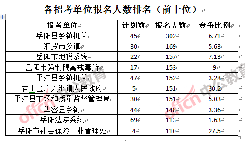 競爭熱門招考單位,前三位依次是:汨羅市人民檢察院(競爭比例32:1)、君山區(qū)廣興洲鎮(zhèn)人民政府(競爭比例30.2:1)和岳陽市社會保險事業(yè)管理處(競爭比例27.5:1)。