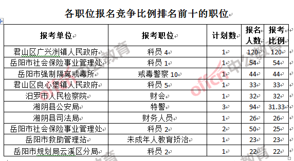 競爭熱門職位,前三位依次是:君山區(qū)廣興洲鎮(zhèn)人民政府科員4(競爭比例120:1)、岳陽市社會保險事業(yè)管理處科員1(競爭比例54:1)和岳陽市強制隔離戒毒所戒毒警察10(競爭比例44:1)。