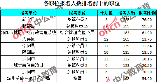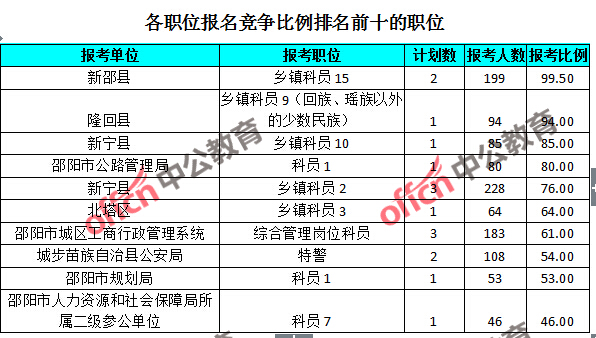 為幫助廣大考生更清晰的了解報(bào)名情況,中公教育整理了湖南邵陽(yáng)各職位的報(bào)名人數(shù)排名以及競(jìng)爭(zhēng)比例排名,供廣大考生參考: