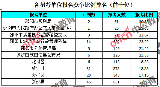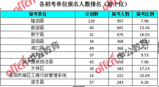 為幫助廣大考生更清晰的了解報(bào)名情況,中公教育整理了湖南邵陽(yáng)各招考單位的報(bào)名人數(shù)排名以及競(jìng)爭(zhēng)比例排名,供廣大考生參考: