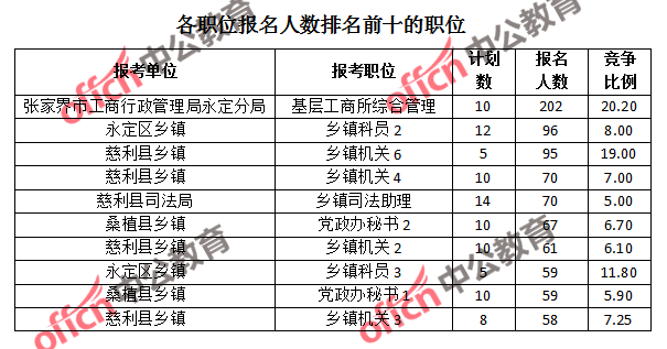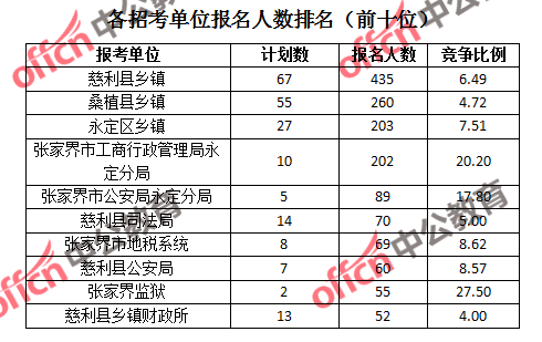 為幫助廣大考生更清晰的了解報(bào)名情況,中公教育整理了張家界市各招考單位的報(bào)名人數(shù)排名以及競(jìng)爭(zhēng)比例排名,供廣大考生參考: