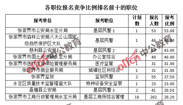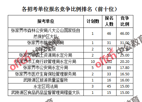 競(jìng)爭(zhēng)熱門招考單位,前三位依次是:張家界市森林公安局八大公山自然保護(hù)區(qū)大隊(duì)(競(jìng)爭(zhēng)比例46:1)、張家界市就業(yè)服務(wù)局(競(jìng)爭(zhēng)比例31:1)和張家界監(jiān)獄(競(jìng)爭(zhēng)比例27.5:1)。