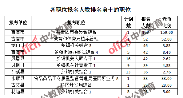 為幫助廣大考生更清晰的了解報(bào)名情況,中公教育整理了湘西市各職位的報(bào)名人數(shù)排名以及競(jìng)爭(zhēng)比例排名,供廣大考生參考: